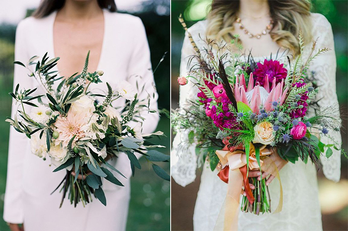 Buquê Desconstruído: ele não obedece nenhuma ordem estética, são assimétricos, podem ser recheado de folhagens, flores de espécies variadas, bastante presente entre as noivas boho;