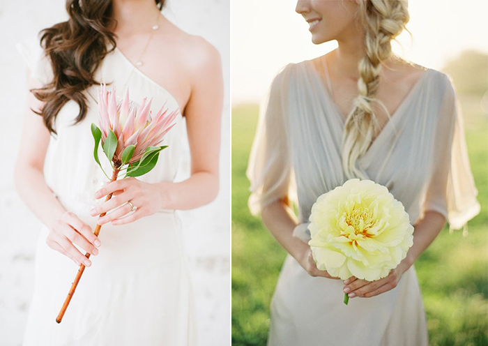 Buquê Flor Única: Apenas uma flor de tamanho grande, é para quem prefere harmonizar o vestido com uma composição mais leve e discreta;