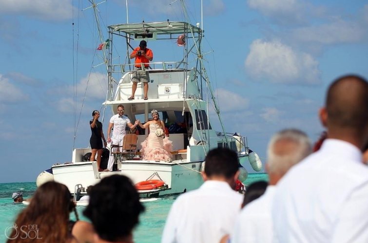 Susana Zamos e seu noivo Jovany tinham o sonho de se casar no meio do oceano. Eles fizeram uma cerimônia em El Cielo, um banco de areia localizado na ilha de Cozumel, no Caribe. Para levar os mais de 100 convidados ao local do casamento, foram usados dois barcos e um catamarã. Na foto, os padrinhos ajudam a decorar a nave, local por onde os noivos vão passar para chegar ao “altar”, as daminhas de honra foram transportadas em cima de uma prancha jogando pétalas de rosas antes da entrada da noiva. A noiva Susana chegou de barco para o casamento na ilha de Cozumel, no Caribe.