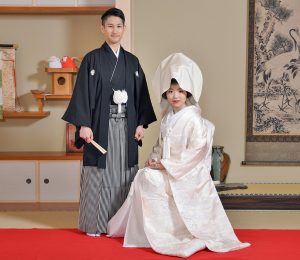 As noivas que realizam sua cerimônia de casamento em um santuário usam um Shiromuku, um quimono de casamento branco que representa a pureza e o sagrado. Além disso, elas também acrescentam um Wataboshi, um chapéu branco que funciona como um véu.