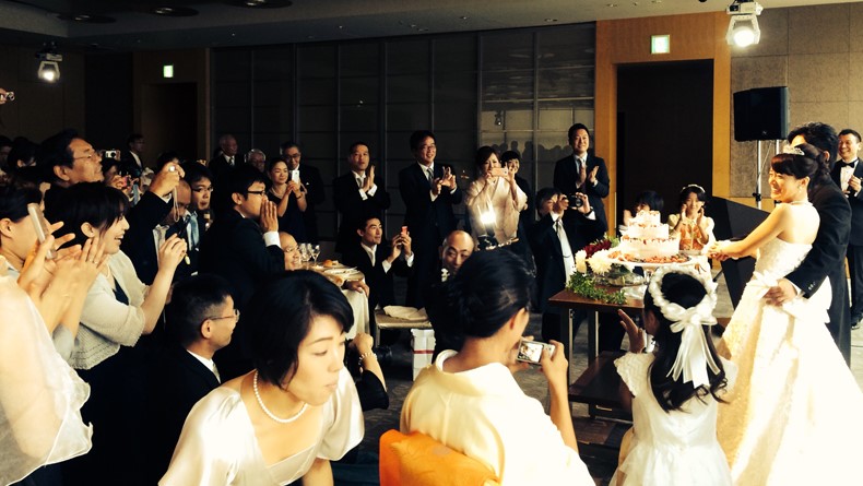 Como os japoneses não dançam, não há primeira dança ou dança de pai e filha. O casal costuma se sentar em um pequeno assento dourado para o banquete de casamento, chamado de Takasago.