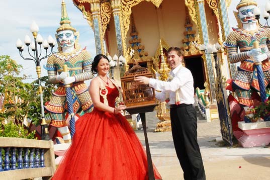 Os parceiros podem decidir por um vestido branco e smoking ou roupas tradicionais de casamento. Um budista japonês, por exemplo, pode vestir um quimono floral, enquanto uma noiva tailandesa pode usar um vestido siwalai com um pano pendurado em um ombro. Tudo isso é bem variável.