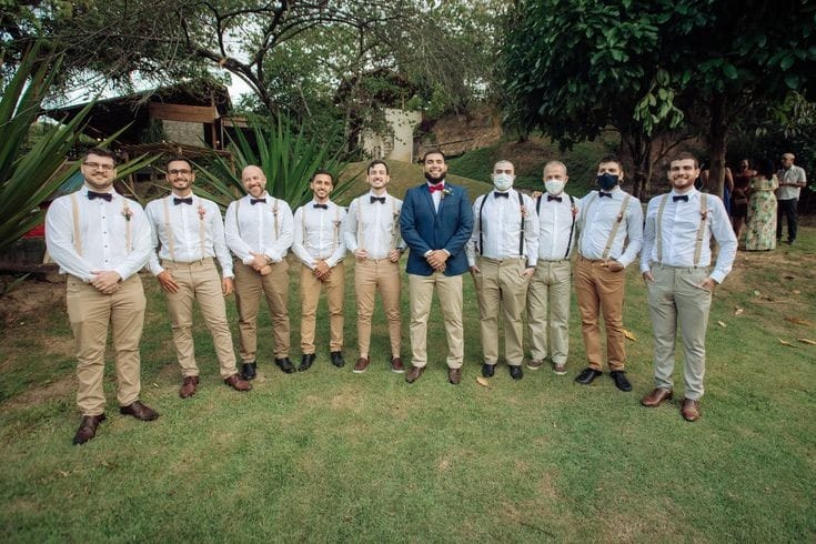O traje do terno é composto por três peças: paletó, calça e colete. Em casamentos, o conjunto completo (com camisa e gravata) é utilizado apenas pelo noivo, o que ajuda a diferencia-lo dos demais, os convidados e padrinhos costumam combinar apenas a calça e o paletó com camisa e gravata.