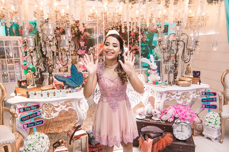 O tão sonhado dia da nossa linda Princesa Yasmin chegou, cada momento, cada detalhe dessa data foi pensado e cuidado com todo carinho. A Debutante escolheu o belíssimo tema: Alice no País das Maravilhas para o seu grande dia, e arrasou com a decoração, simplesmente maravilhosa e bem original! Yasmin, escolheu o azul, perolado e o rose para os seus três Modelos de Vestidos de 15 anos.